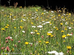 Description: Große landwirtschaftliche Nutzflächen werden zum Beispiel im Alpenvorland oder auf der Schwäbischen Alb als Grünland genutzt. Damit sich die Gras- und Heuproduktion aber auch wirtschaftlich lohnt, muss ordentlich gedüngt werden. Doch viel düngen und häufig mähen – das vertragen nur wenige Pflanzen- und Tierarten. Dabei ist die Vielfalt an Pflanzen und Tieren direkt von der Nutzungsintensität abhängig. Es verwundert deshalb nicht, dass heute nur noch ein geringer Anteil des Grünlandes wirklich blütenreich ist: Bei intensiver Nutzung verschwinden die Blumen, und die Gräser übernehmen die Herrschaft. Wird dagegen, wie früher üblich, nur zwei bis dreimal im Jahr gemäht und wenig gedüngt - und das am besten nur mit Festmist - dann blühen in solche Wiesen viele Blumen, welche wiederum zahlreichen Tieren Nahrung und Lebensraum bieten. Bei Streuobstwiesen sind insbesondere große, hochstämmige Obstbäume für viele Tierarten als Lebensraum geeignet. Ihr ökologischer Wert wird noch gesteigert, wenn auch abgestorbene Teile am Baum bleiben dürfen, bis der Wind sie abbricht. In diesem Lebensraum können folgende Arten des 111-Artenkorbes vorkommen: Säugetiere: Braunes Langohr, Gartenschläfer, Großer Abendsegler, Haselmaus Vögel: Bluthänfling, Braunkehlchen, Distelfink, Feldlerche, Gartenrotschwanz, Neuntöter, Rotmilan, Steinkauz, Wendehals Schmetterlinge: Dunkler Wiesenknopf-Ameisenbläuling Käfer: Kirschbaum-Prachtkäfer Wildbienen: Blauschwarze Holzbiene, Bunthummel, Grauschuppige Sandbiene, Skabiosen-Sandbiene Heuschrecken: Plumpschrecke, Wanstschrecke Pflanzen: Arnika - Zurück zur Ausgangsseite -