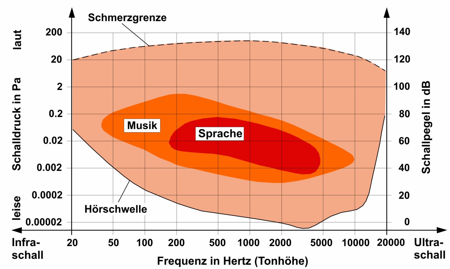Description: Beim Hören werden die raschen Schwankungen des Luftdrucks in eine Sinneswahrnehmung umgewandelt. Luftschall trifft auf unser Ohr und gelangt über Gehörgang, Trommelfell und Gehörknöchelchen zum Innenohr. Dort bringt er die Membran in dem nur erbsengroßen Hörorgan, der so genannten Schnecke (Cochlea), zum Schwingen. Darin befinden sich rund 20 000 hochempfindliche Haarzellen. Diese geben elektrische Impulse an die Hörnerven ab. Von dort werden sie an das Gehirn weitergeleitet, wo die Auswertung der Impulse als Information erfolgt. Betrachtet man nur die Lautstärke (gemessen in Dezibel, dB), wird der Bereich des Hörens einerseits von der Hörschwelle und andererseits von der Schmerzgrenze eingefasst. Die Hörschwelle ist die untere Grenze unserer Wahrnehmungsfähigkeit für Schall. Ein Geräusch an der Schmerzgrenze dagegen tut uns körperlich weh. Den Anstieg der Lautstärke dazwischen empfinden wir nicht gleichmäßig: Erst wenn der Schalldruck (gemessen in Pascal, Pa) auf den zehnfachen Wert ansteigt, nehmen wir ein Geräusch als doppelt so laut wahr. Unser Ohr kann Schallintensitäten wahrnehmen, die sich um zwölf Zehnerpotenzen unterscheiden. Zum Vergleich: Wäre das Ohr eine Waage, müsste sie Gewichte zwischen 1 Milligramm und 1 000 Tonnen anzeigen können. Um diese gewaltige Spanne überhaupt darstellen zu können, ist die Dezibelskala logarithmisch aufgebaut. Geräuschpegel werden üblicherweise in dB(A) angegeben. Das bedeutet, dass die Lautstärke von Geräuschen in Abhängigkeit von den vorherrschenden Tonhöhen (Frequenzen, angegeben in Hertz, kurz Hz) mit dem sogenannten A-Frequenzfilter bewertet wird. Dieser Frequenzfilter ist dem menschlichen Hörvermögen nachempfunden, das im Bereich sehr tiefer und sehr hoher Frequenzen weniger stark ausgeprägt ist. Sehr tiefe und sehr hohe Töne müssen daher lauter sein, um von uns noch als Töne wahrgenommen zu werden. Die A-Bewertung reduziert die vorherrschenden Pegel im tieffrequenten sowie im sehr hochfrequenten Bereich darum auf die tatsächlich hörbaren Geräusche.