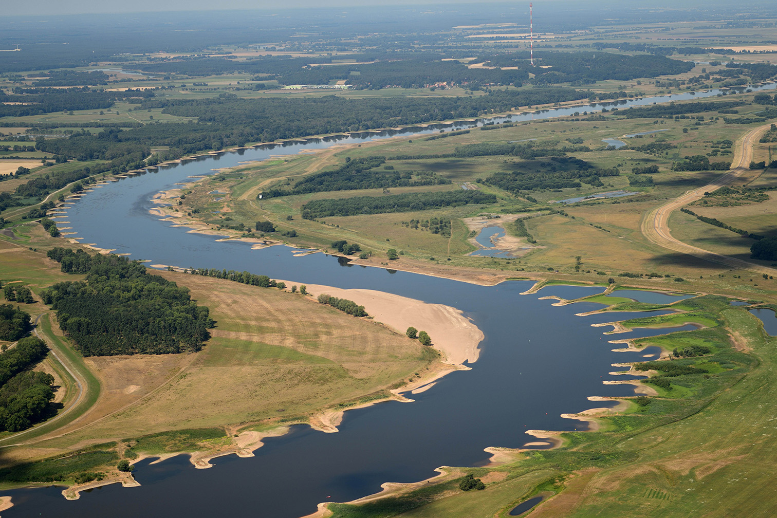 https://www.gewaessergueteonline.nlwkn.niedersachsen.de/ (Webseite)Besonders aus der Luft werden die Auswirkungen der anhaltenden Trockenheit sichtbar – wie hier an der Elbe südlich von Schnackenburg.