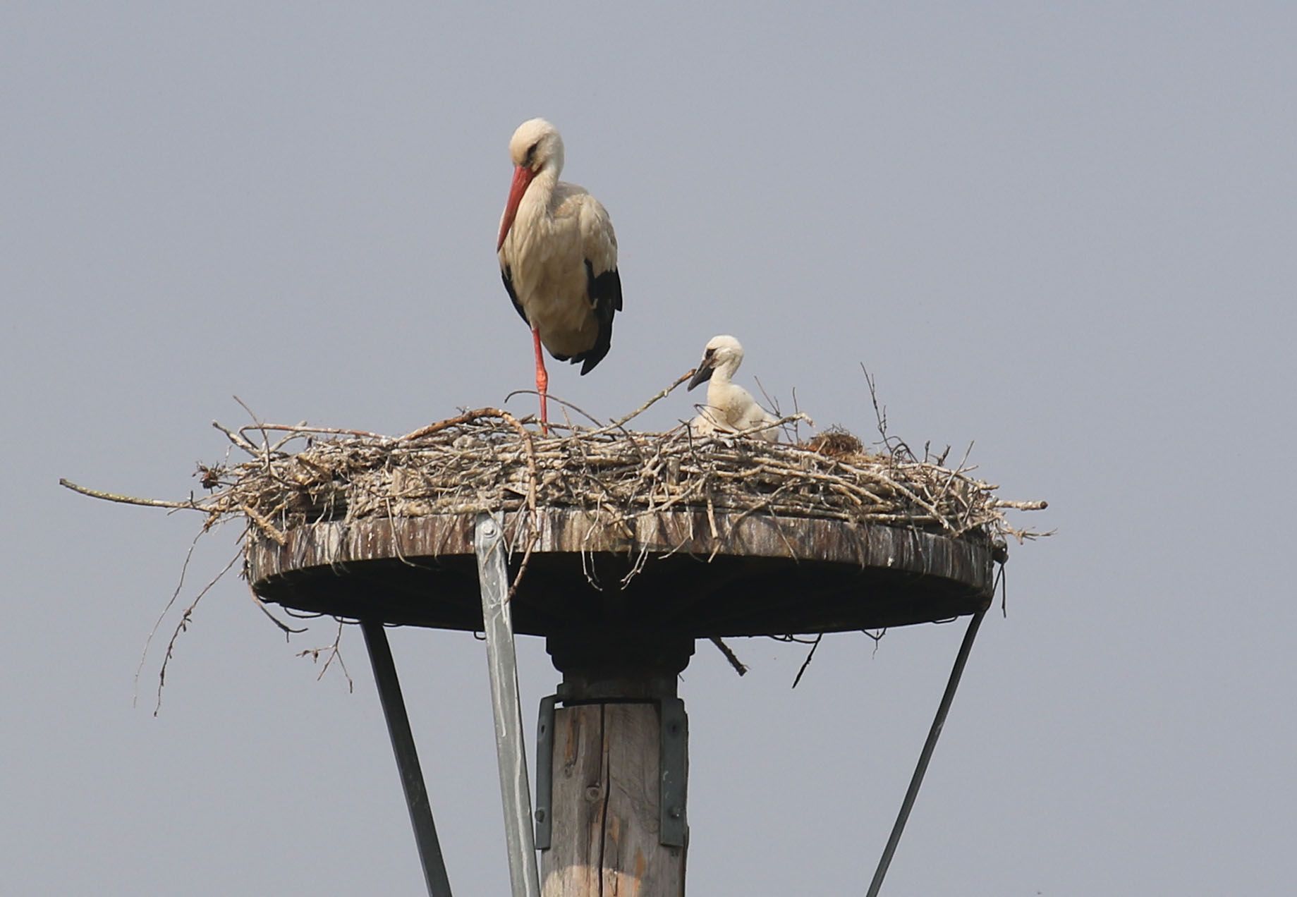 Ein Weißstorch mit dem Jungvogel auf der Maulohe in der Allerniederung bei Verden. Der erste Bruterfolg in dem vom NLWKN errichteten Kunsthorst. (Foto: Hans-Joachim Winter)